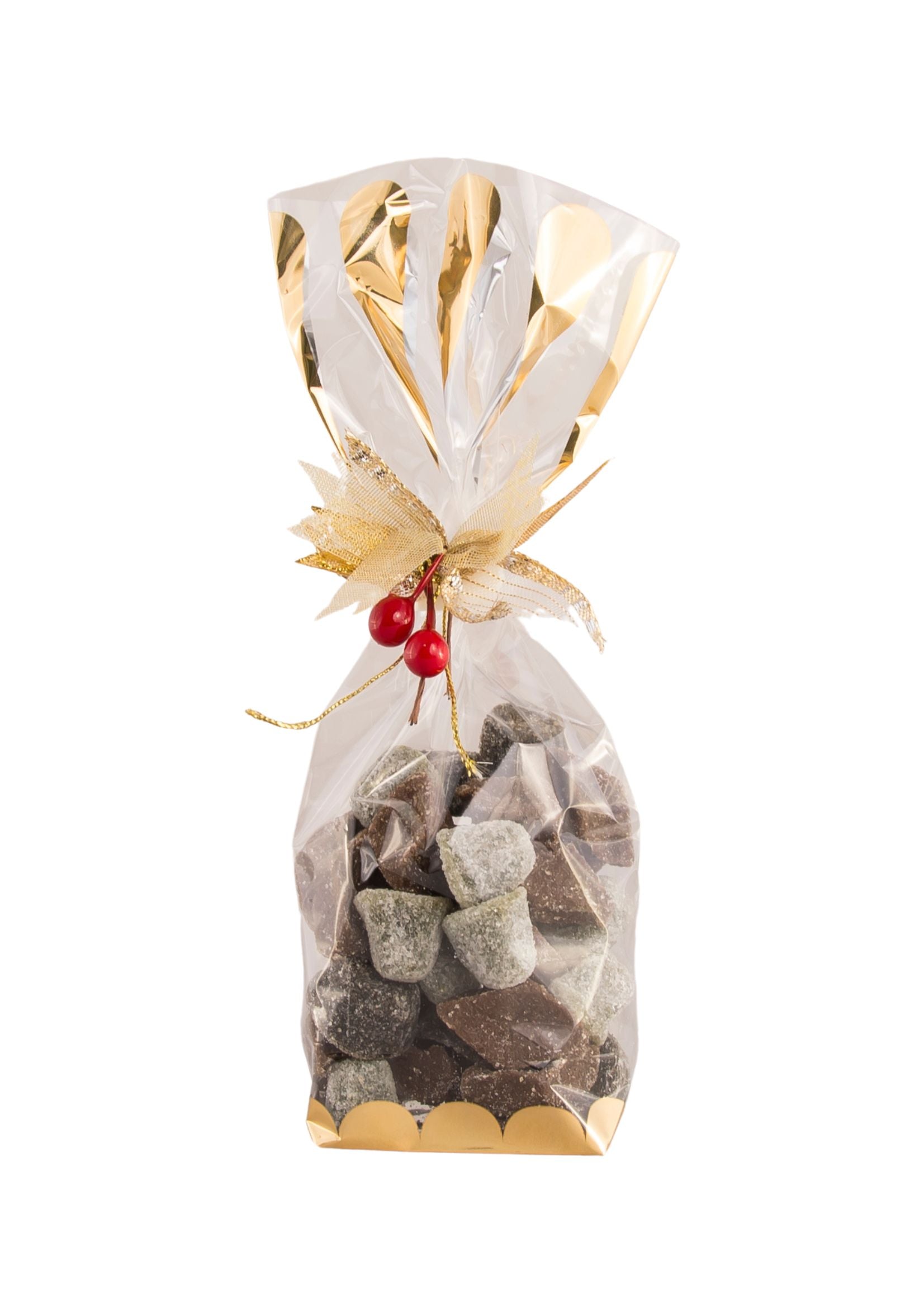 De kruisbodemzak is een typische stazak en wordt ook wel toefzak genoemd. De producten die kunnen worden verpakt zijn heel divers. Voorbeelden zijn noten, snoep en chocolade, maar ook non-food artikelen worden verpakt in deze zak. Deze zak is ook uitermate geschikt voor de wat luxere artikelen. Dit model leent zich namelijk uitstekend om mooi af te maken met een mooie toef. De maatvoering wordt aangegeven als Breedte x Hoogte. De zak is leverbaar met een cellofaan of een kartonnen bodemblad. De kruisbodemzak met kartonnen, zilveren bodemblad, presenteert het product nog mooier en geeft een bijzondere luxe uitstraling, dus meerwaarde, aan de inhoud.