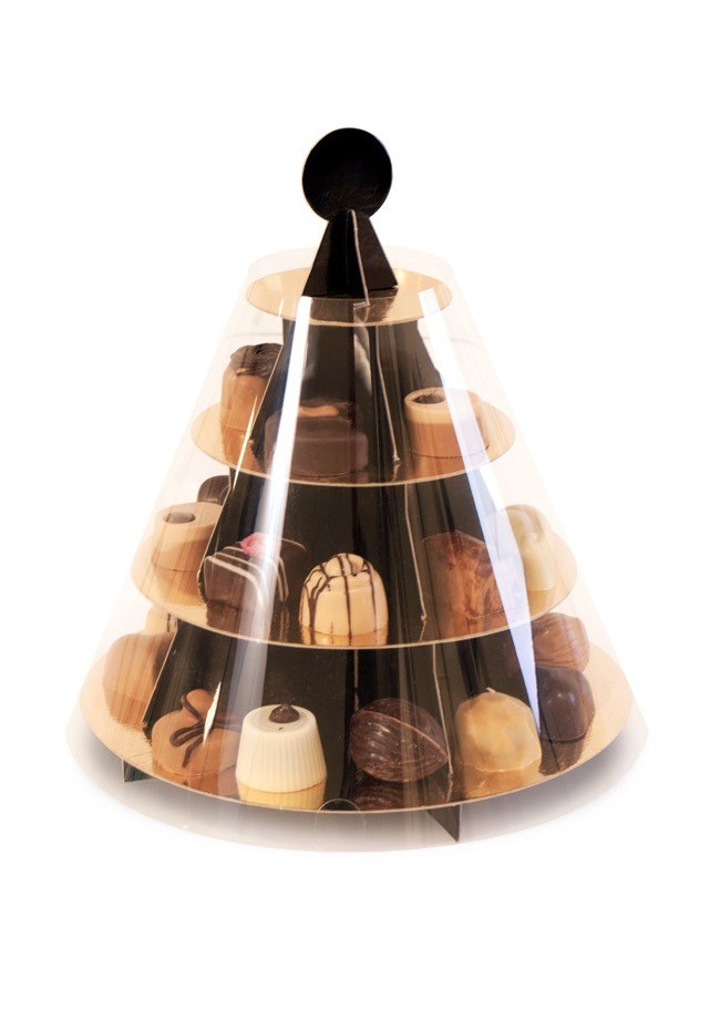 Eens een heel andere cadeauverpakking voor bonbons, koekjes of andere zoetigheden. De etagères worden aangeleverd als eenvoudige bouwpakketjes. Ze zijn 100% voedselveilig dus uw producten kunnen rechtstreeks op de plateaus geplaatst worden. En om het helemaal af te maken passen ze ook nog in onze diamantzakken.