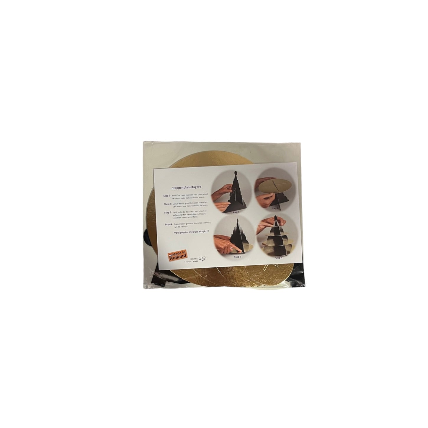 De etagère is er in 2 maten, een met een bodem van 16 cm doorsnee en een met een bodem van 20 cm. Ze zijn gemaakt van karton. De plateaus zijn gecacheerd, de ene zijde in goud, de andere zijde in zilver zodat uw product altijd op zijn best uitkomt. Dit product beschikt niet over de kunststof sleeve.